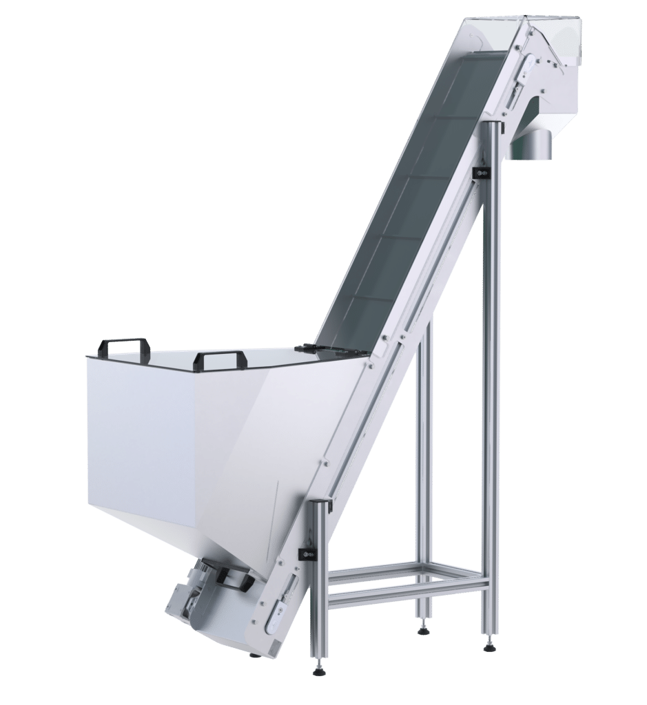 Mit durchdachten und multifunktionalen Anbauteilen verwandelt sich der bewährte Robotunits Gurtförderer C4N in einen Bunker- oder Trichterförderer mit vielfältigen Anwendungsmöglichkeiten: beispielsweise als ideale Lösung für das Beschicken von Maschinen mit Schüttgut oder auch als Zuführung in Rütteltöpfe oder Wendelförderer.