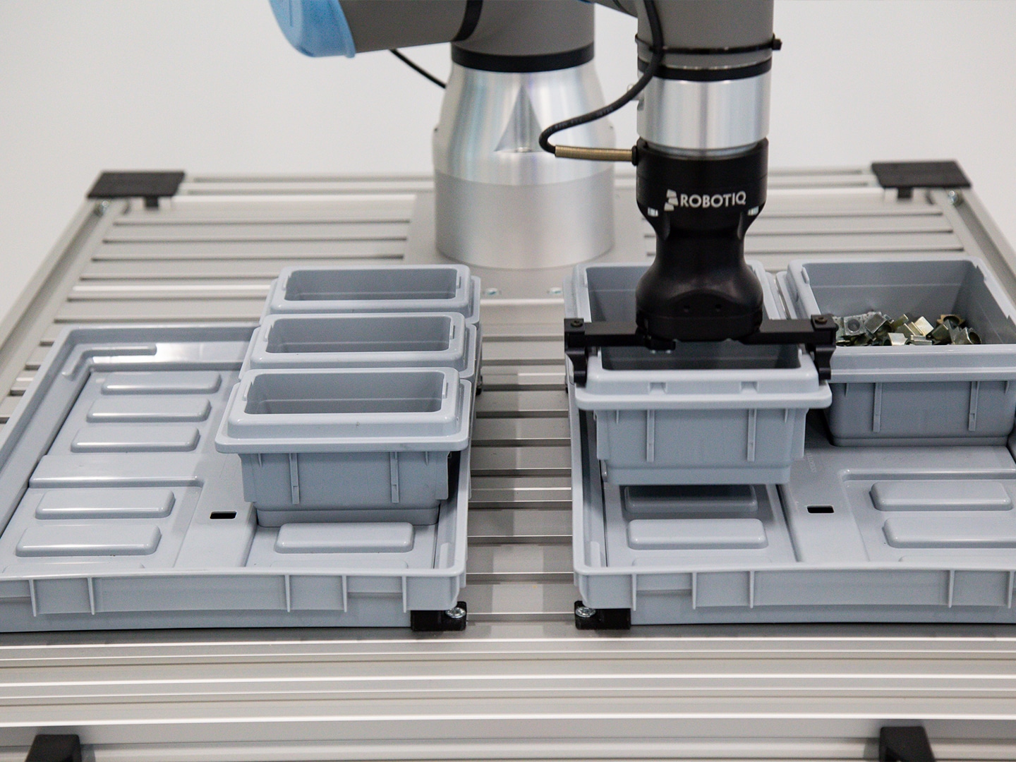 Um diese einmalige Investition so einfach und gering wie möglich zu halten, kann ein kollaborativer Roboter auf einem simplen Aufbau in bestehende Produktionsstätten beziehungsweise Fertigungsbereiche integriert werden. Diese maßgeschneiderte Cobot-Station aus dem Robotunits Automatisierungsbaukasten unterstützt als modularer Unterbau für kollaborative Roboter bereits einige Unternehmen in ihrer Fertigung.