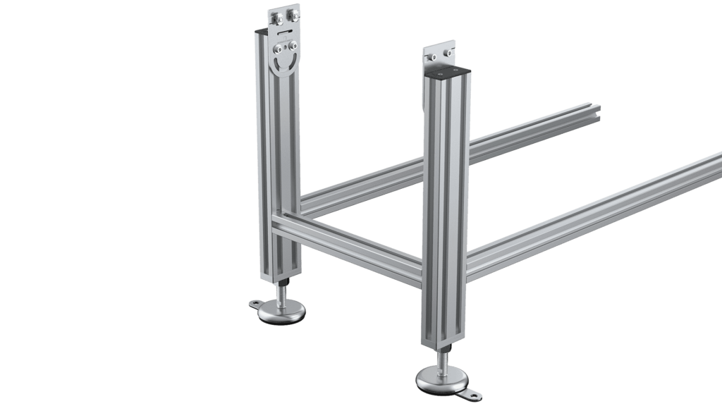 La subestructura estándar se utiliza para nuestros transportadores de banda 40, 50 y 80. Para este diseño se ocupan los siguientes tamaños de perfil: 40×40, 50×50 y 40×80. El diseño de tipo «ancho» garantiza la estabilidad aún cuando haya una relación desventajosa entre la altura de la banda transportadora y la anchura del bastidor.