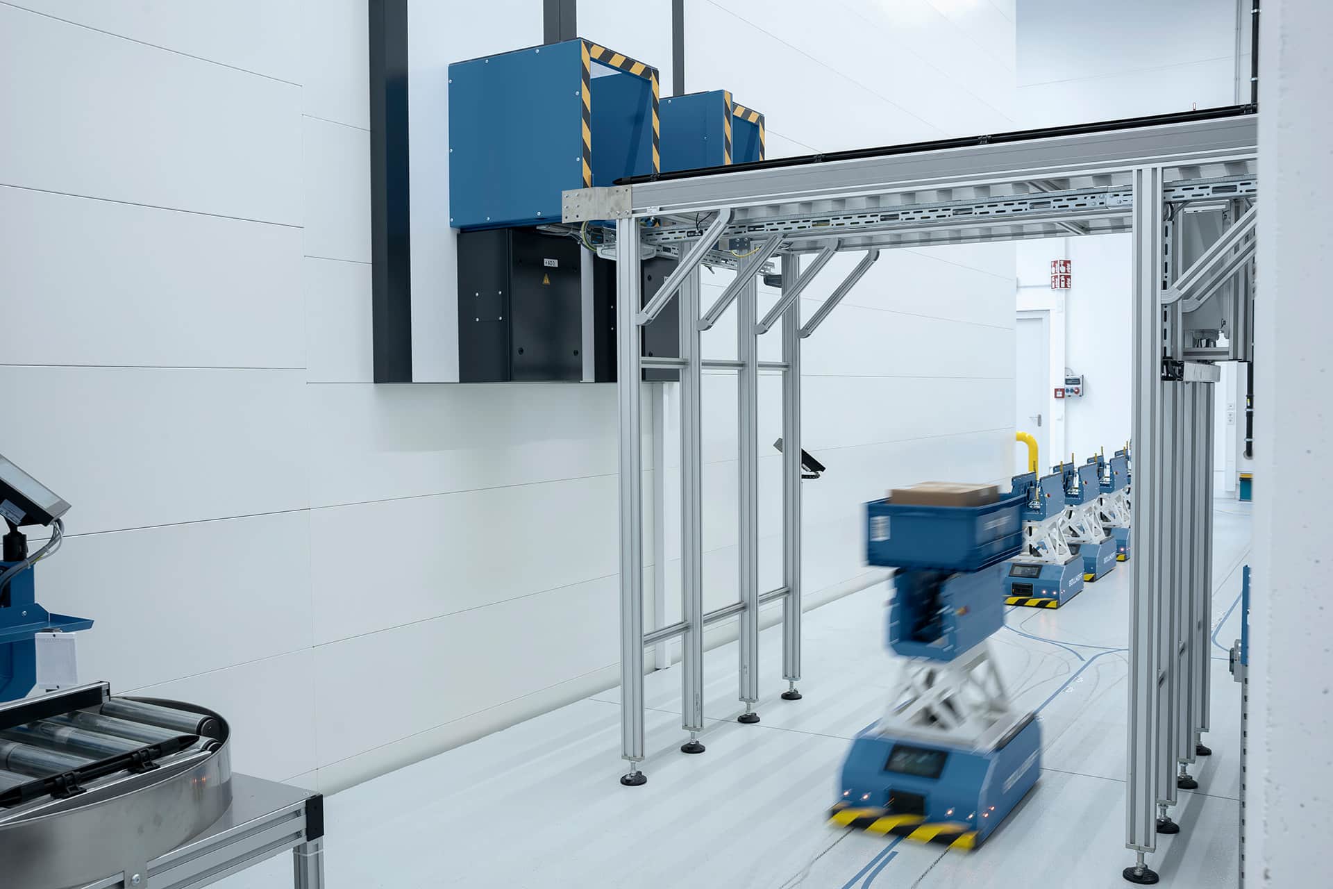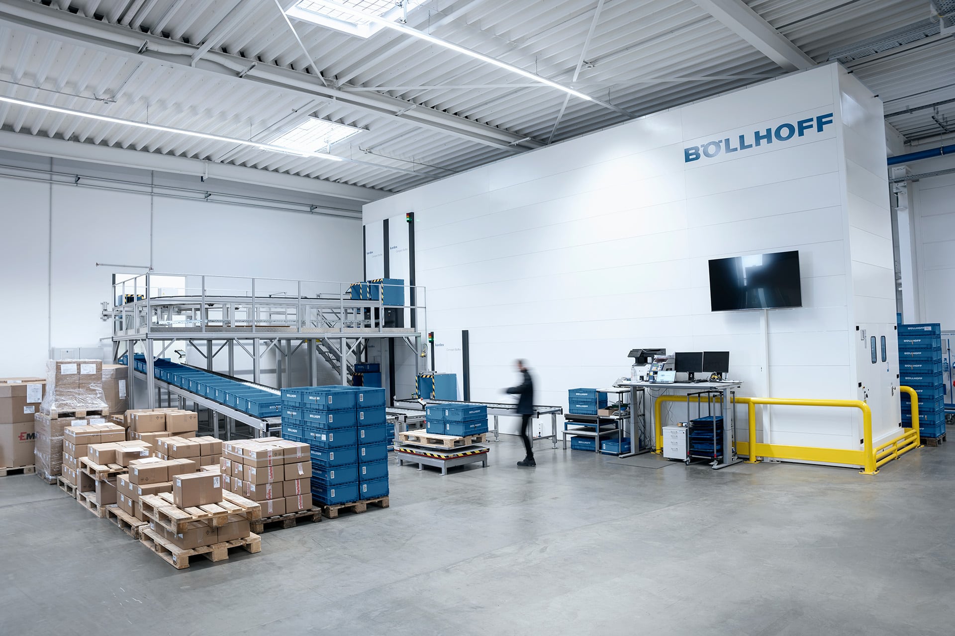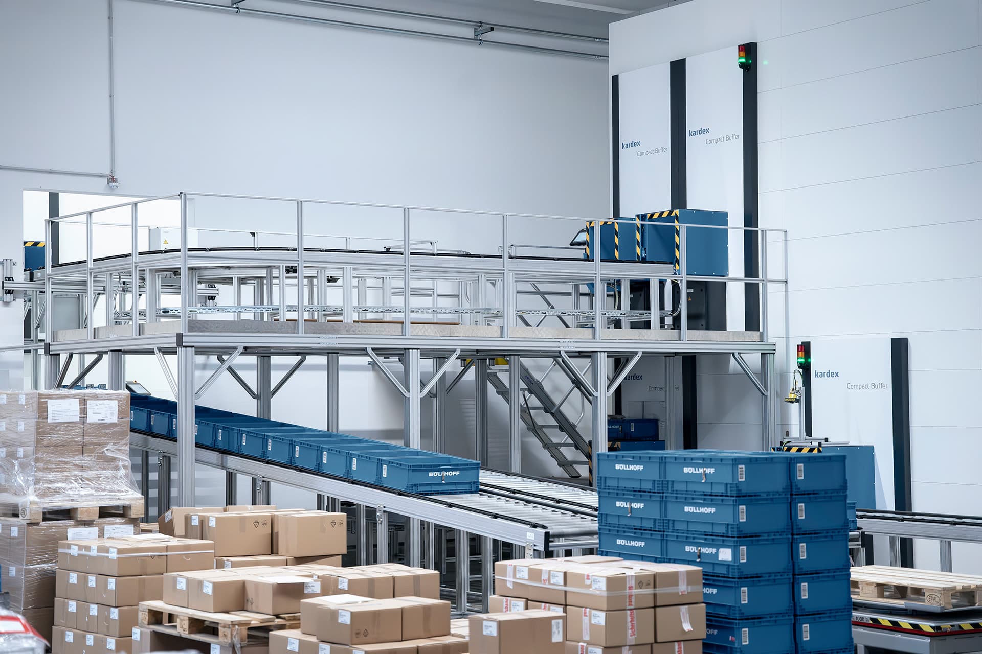 Um bei der Böllhoff Produktion GmbH sämtliche Transportprozesse an den Montageautomaten einfacher, schneller und flexibler zu gestalten, entschied sich das Unternehmen für die Investition in eine maßgeschneiderte Technologie mit vollautomatischer Lagerung durch ein Kardex System. Es besteht aus zwei Kardex Vertical Buffer Modulen mit je vier Bedienöffnungen und einer dazu passenden Fördertechnik-Konstruktion. Die Robotunits Rollenfördertechnik sorgt dabei für die automatisierte Bereitstellung der Artikel in KLTs. Diese werden dann bedarfsgerecht von einem FTS mit einem Robotunits Fördertechnik-Aufbau nahtlos übernommen und zum richtigen Montageautomaten transportiert.