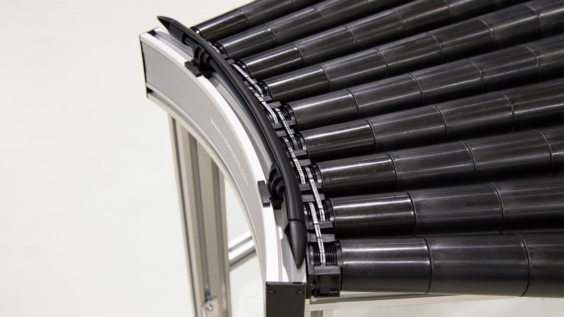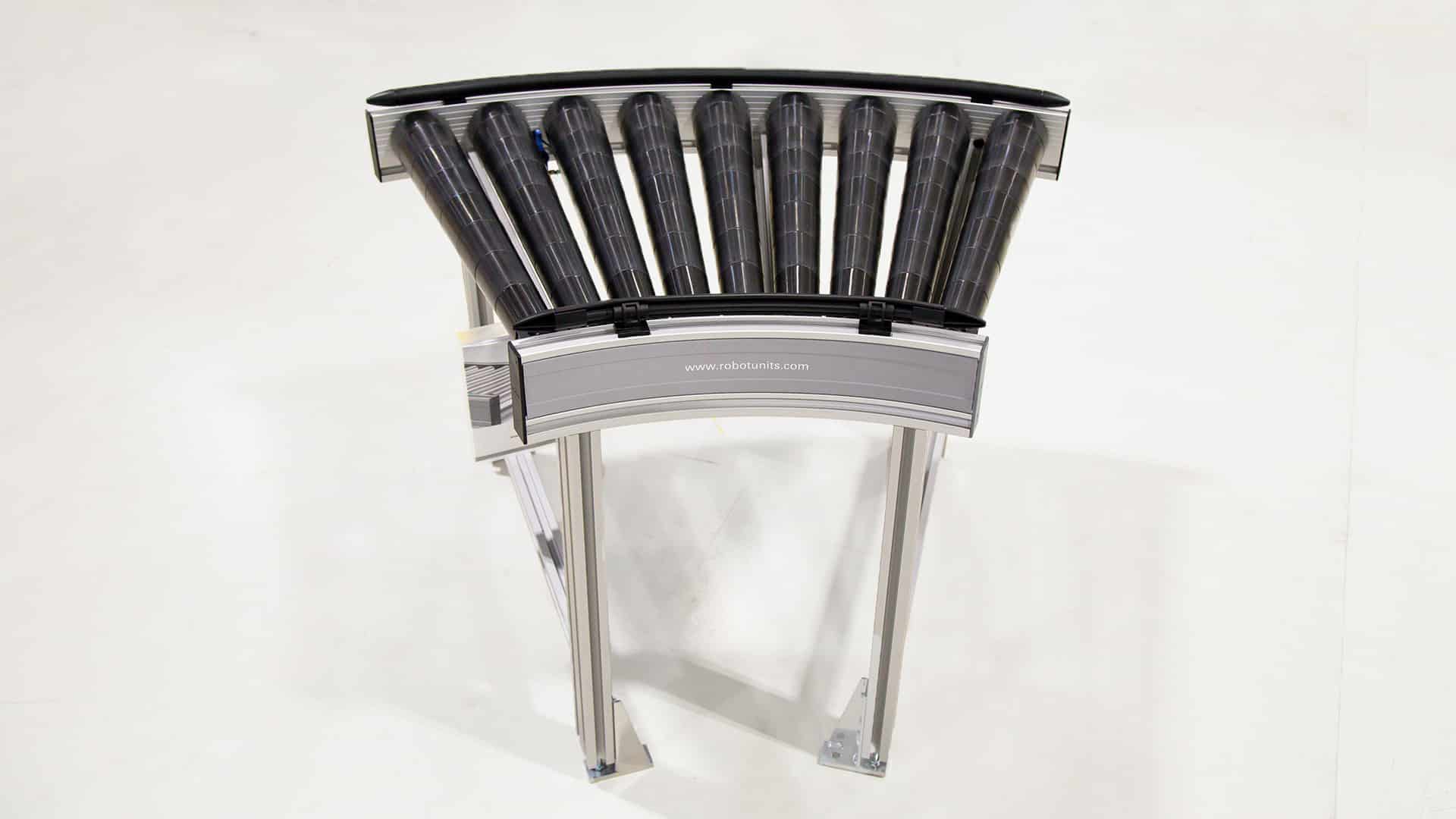 Der Kurven Rollenförderer von Robotunits optimiert den lagetreuen Materialtransport um Kurven, ohne das Fördergut zu heben oder zu verschieben. Mit diesem System lassen sich Produkte reibungslos um 45° oder 90° bewegen. Durch das Hinzufügen weiterer Module sind auch Winkel von 135° bis zu 180° möglich.