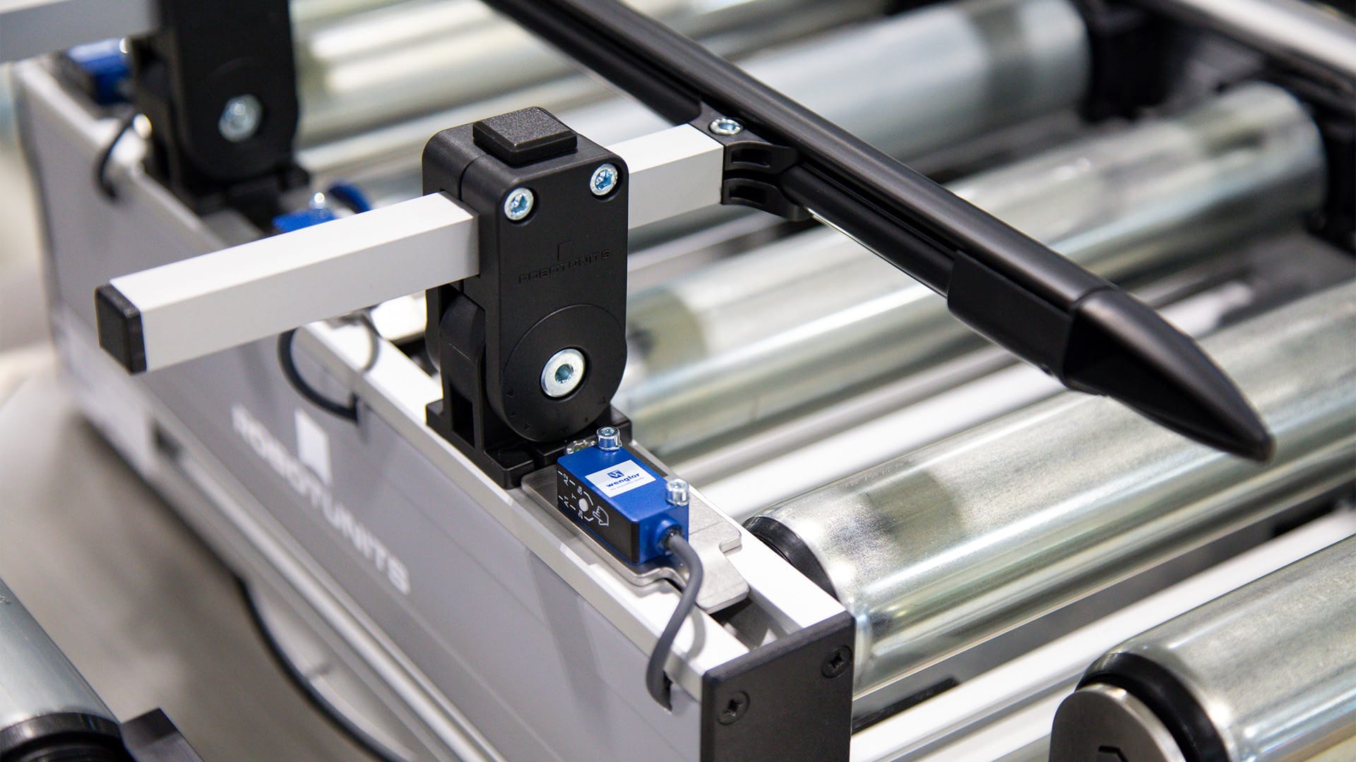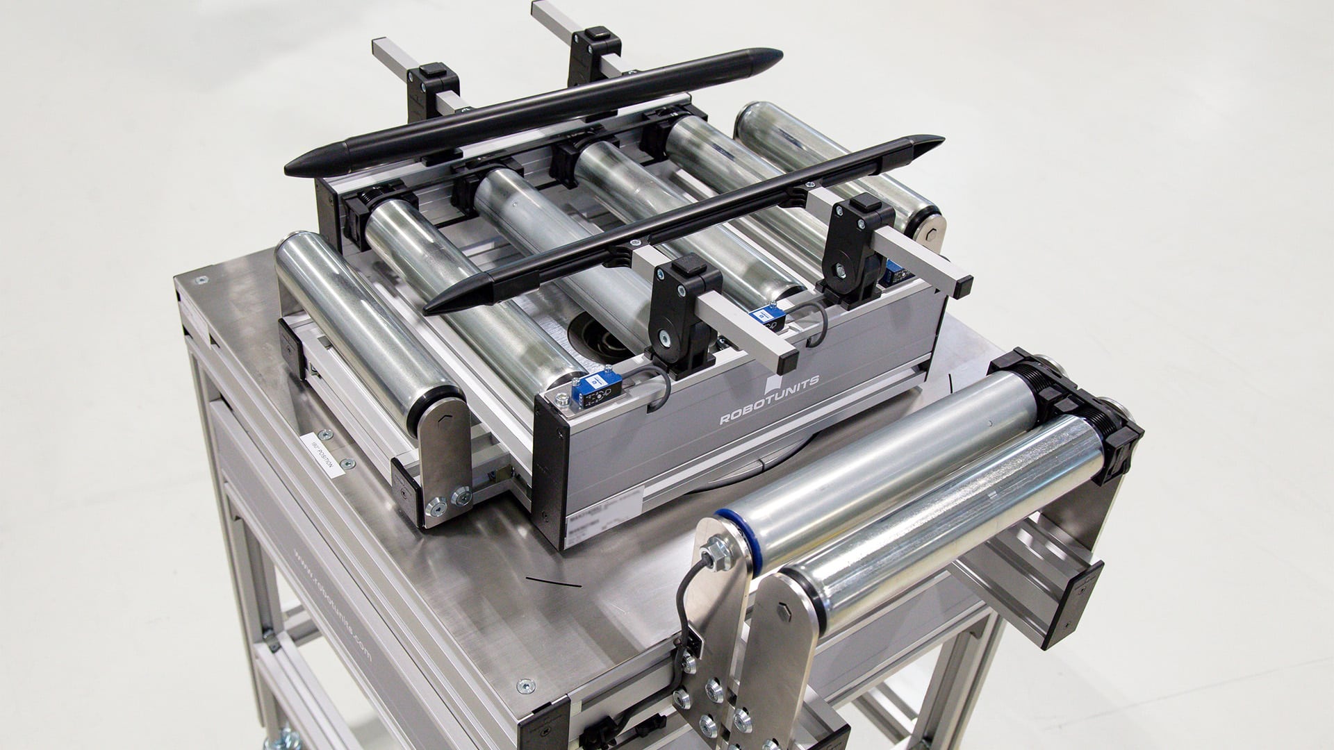 Bei Rollenförderer von Robotunits ist die einfache Steuerung direkt im Profil integriert. Zur einfachen Steuerung gehören: ZPA (Zero Pressure Accumulation), Transportieren in eine Richtung sowie Starten und Stoppen mit Hilfe von Sensoren. Zusätzlich können kundenseitig beispielsweise mit SPS auch komplexere Steuerungen ganz einfach angeschlossen werden.