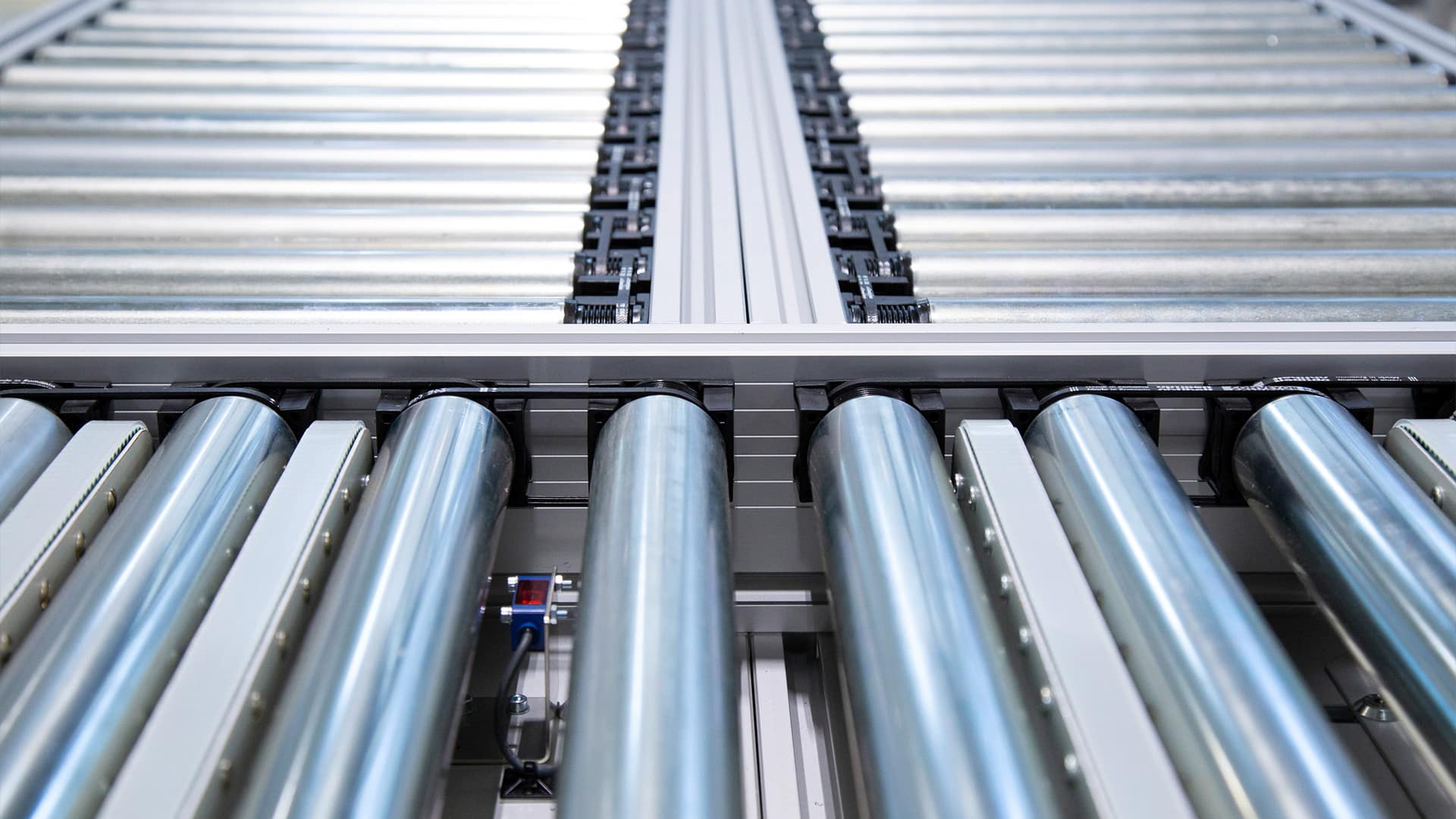 Bei der Rollenfördertechnik von Robotunits gibt es grundsätzlich immer eine Motorrolle, die eine Zone mit mehreren Tragrollen bewegt. Dabei wird das gesamte Rollenförderband über 24V angetrieben. Sämtliche Steuerung ist bereits im Profil verbaut. Über Sensoren kann bei Bedarf die ZPA Logik bereits direkt integriert werden. Als Plug-and-Play Lösung aus dem Automatisierungsbaukasten lässt sich die angetriebene Rollenbahn von Robotunits einfach, schnell und flexibel in Ihren Betrieb integrieren.