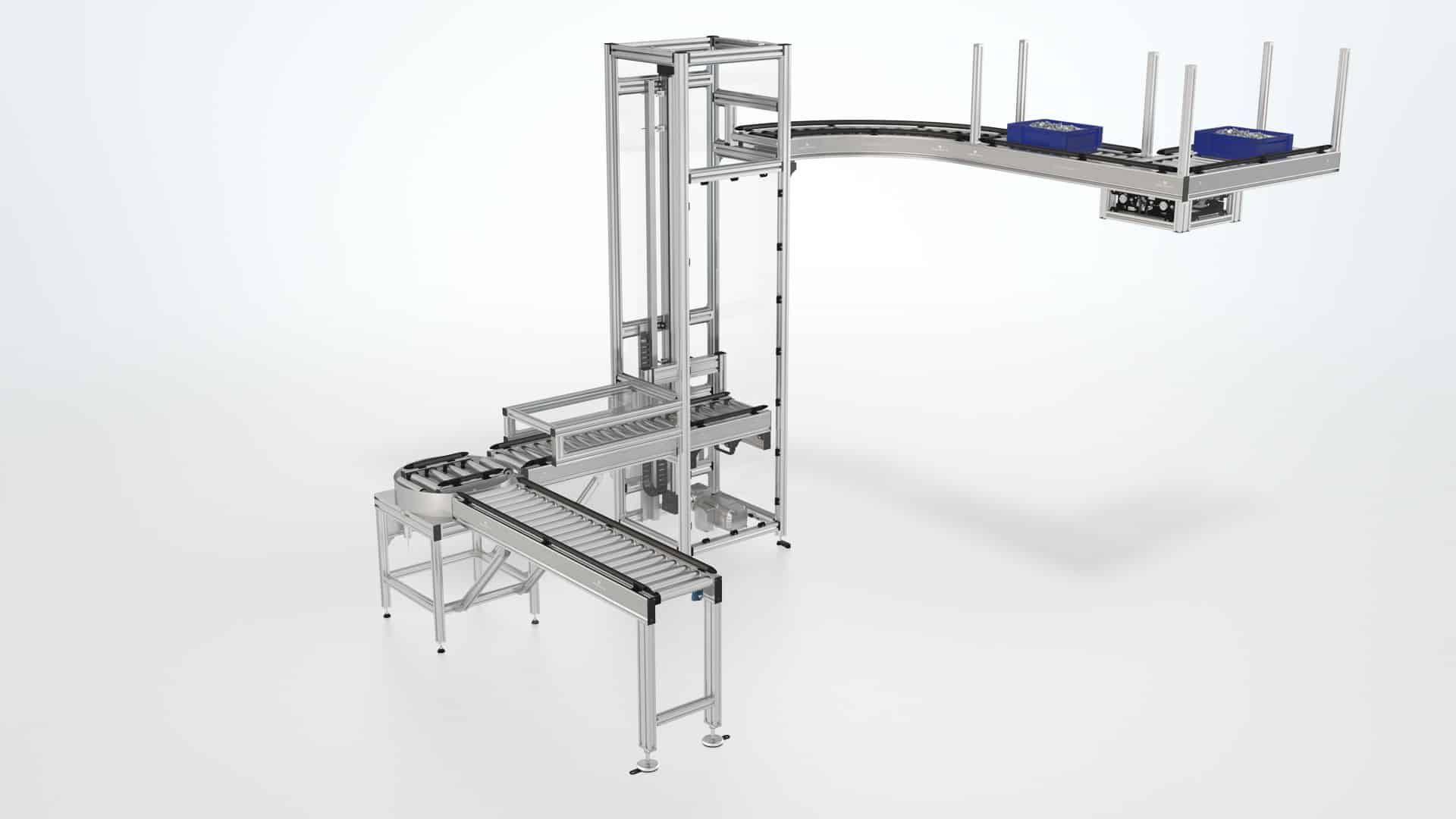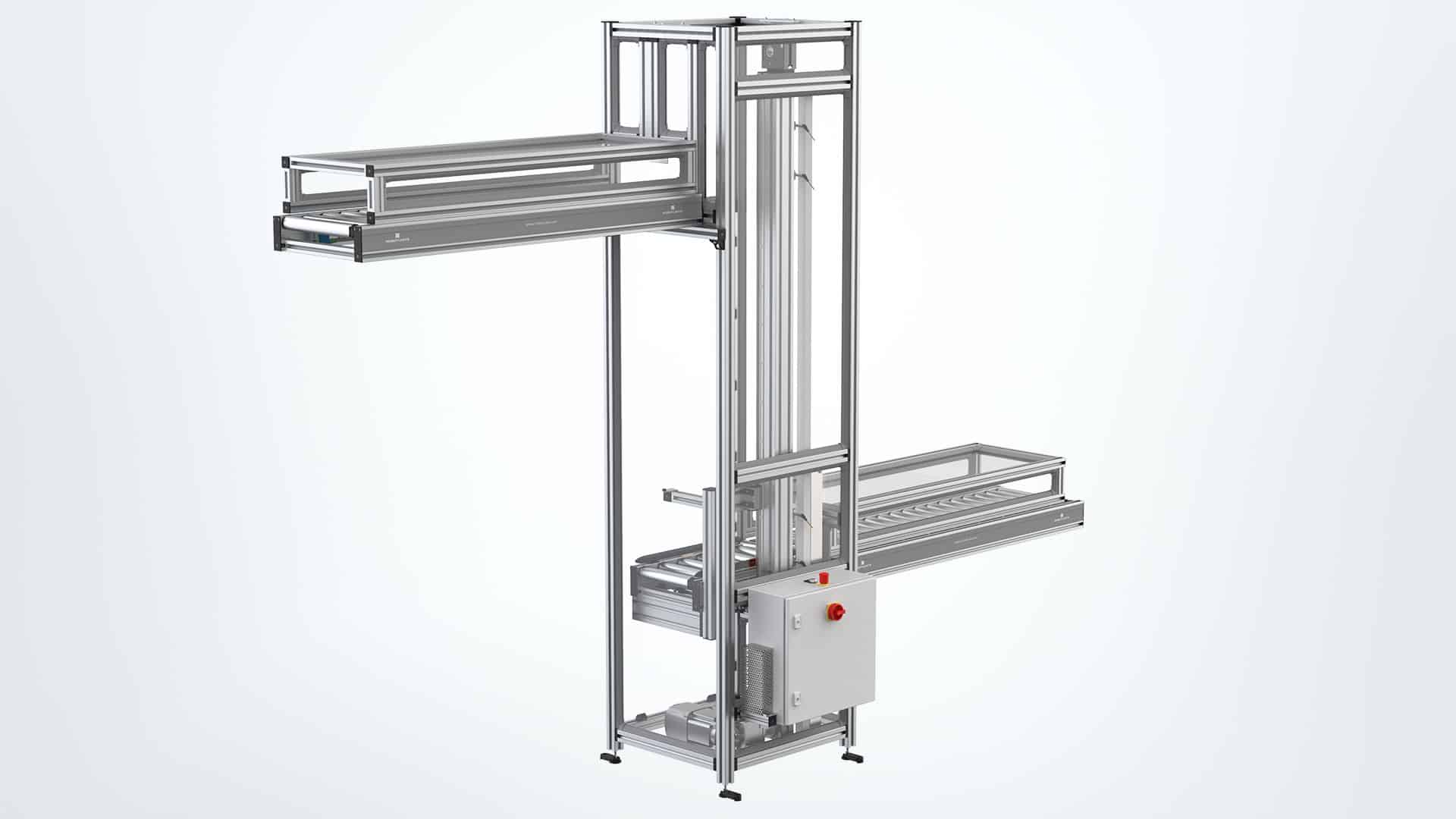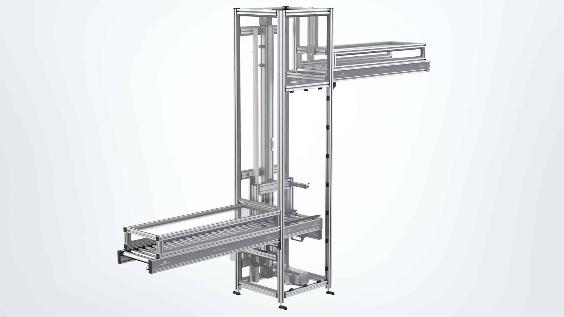Der Heber aus dem Robotunits Rollenfördersystem als eine effiziente Lösung für den Ebenen übergreifenden Materialtransport in industriellen Umgebungen: Mit standardisierter Vorprogrammierung ermöglicht er einen unkomplizierten Plug-and-Play Einsatz bei einer Höhe von bis zu 5 Metern im Standard. Die Lastaufnahme kann flexibel mit Drehtischen oder Eckumsetzungen ausgestattet werden, um seitliche Bewegungen oder Umleitungen des Materials zu ermöglichen.