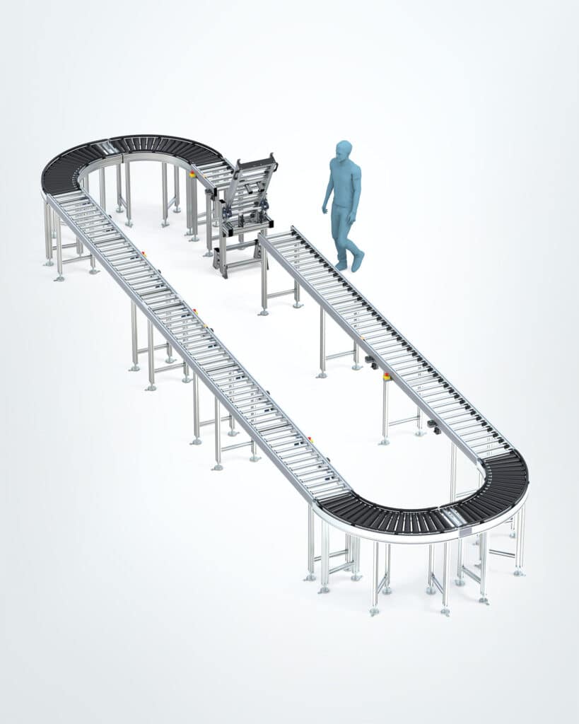 Grundsätzlich wird zwischen angetriebenen Rollenbahnen und Schwerkraftrollenbahnen unterschieden. Bei den angetriebenen Rollenbahnen decken verschiedene Formen und Module eine Vielzahl an Einsatzmöglichkeiten ab. So können Materialien auch beispielsweise um eine Kurve im passenden Winkel transportiert werden. Bei einer Abzweigung um 90° bieten die Dreheinheit oder der Eckumsetzer die ideale Lösung, je nach dem, ob das Fördergut einen Richtungswechsel erleben darf, oder nicht. Eine weitere Art von Rollenförderer ist der Einschleuser und Ausschleuser. Systemergänzend spielt vor allem der Heber eine wichtige Rolle, um die Rollenfördertechnologie auch Ebenen übergreifend nutzen zu können.