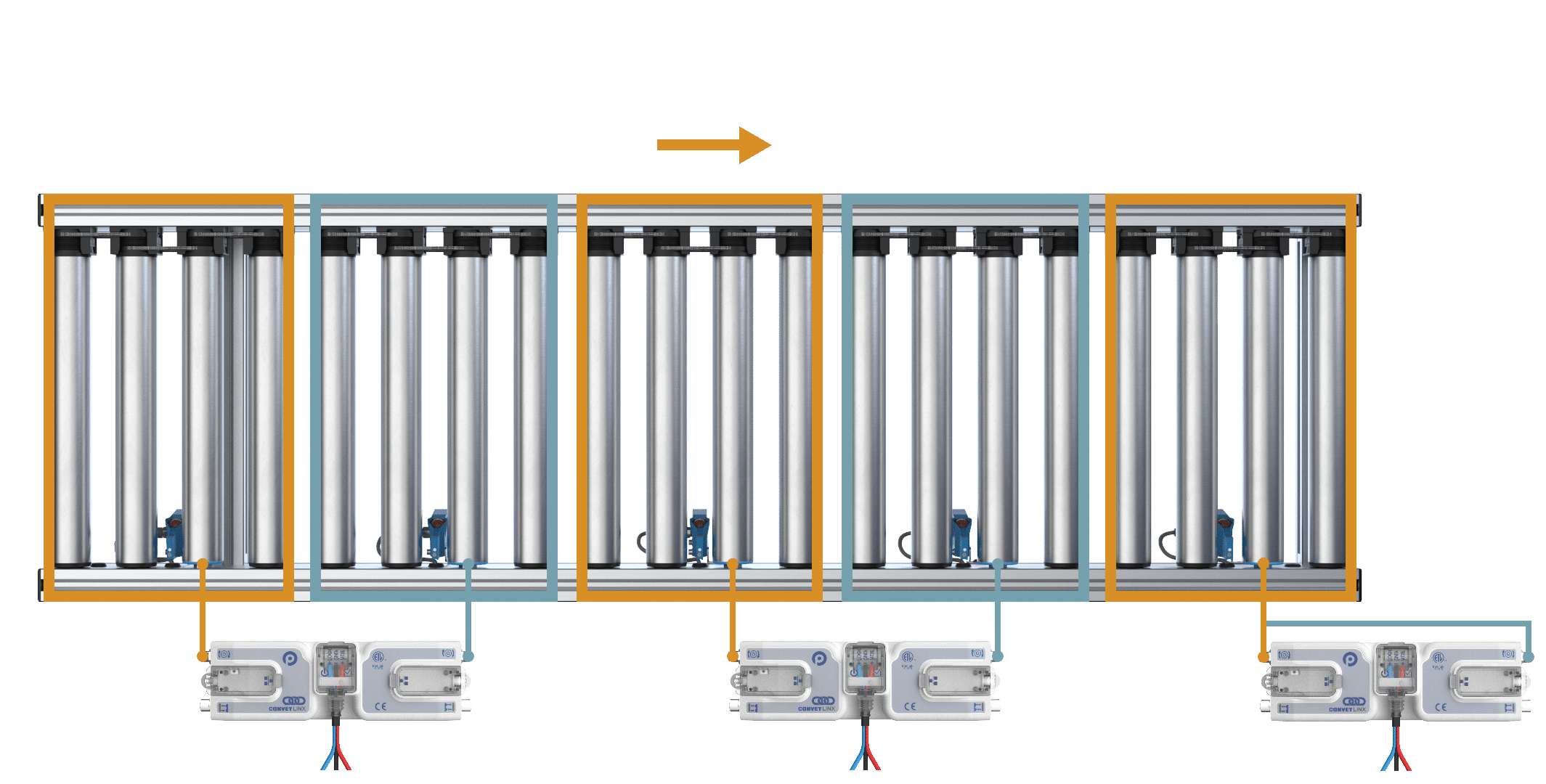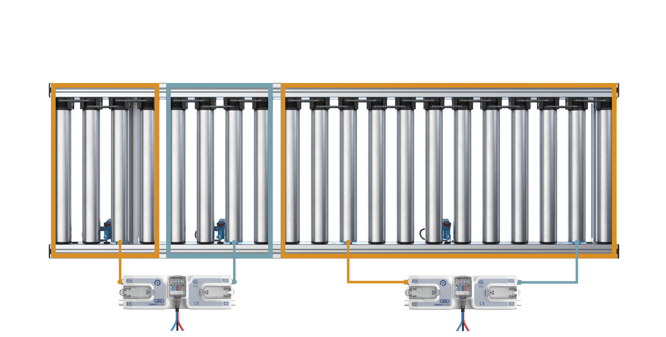 Der Controller erkennt, wenn es sich um eine lange Zone mit 2 Motorrollen handelt. Es sind dann auf dem Controller 2 Motorrollen und nur ein Sensor angeschlossen.